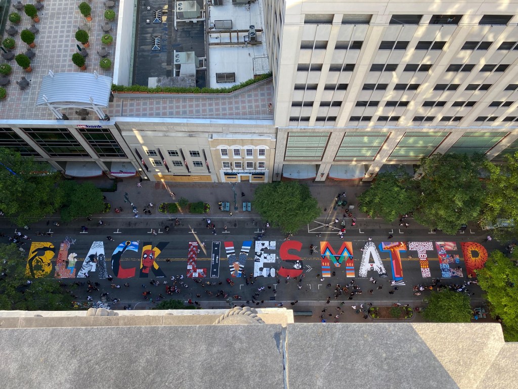 - A Black Lives Matter mural painted by 17 local artists near the intersection of Trade and Tryon streets, the city’s historic heart. The mural reflects the artists’ perspectives on the phrase “Black Lives Matter” when they painted it in June 2020. The block, which the city closed to traffic until November 2020, became a place for community pride, expression and gathering at a distance.