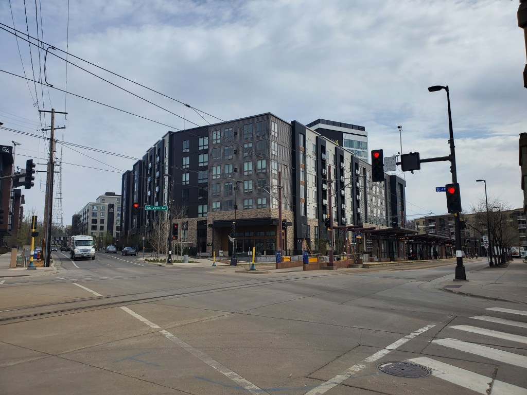 The Link Minneapolis, a mixed-use apartment complex, next to the Prospect Park Green Line Station
