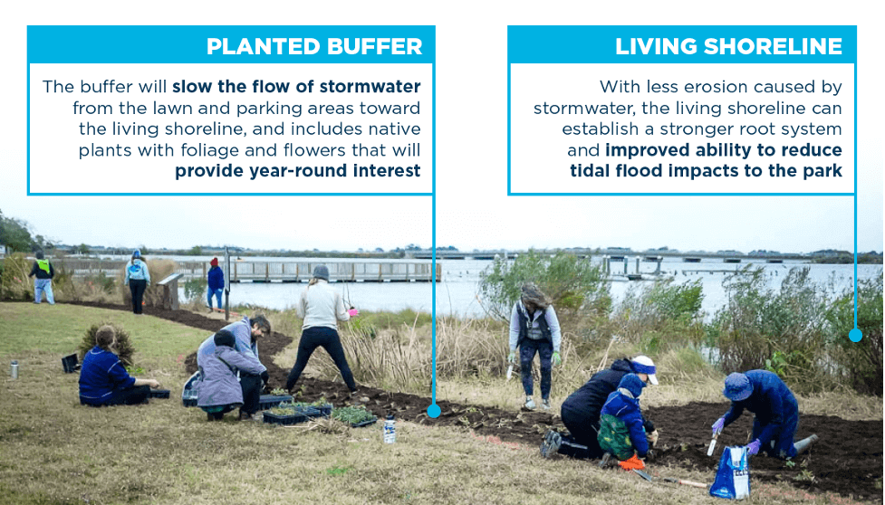 Meanwhile, in the City of Hampton, Virginia, the American Flood Coalition and Partnership for a New Phoebus worked together to actively engage community members to find low-cost, effective solutions to build flood resiliency. For Hampton, this took shape in the form of reimagining an existing Adopt-A-Spot Program to focus more heavily on flood mitigation. By organizing volunteer workdays, the Phoebus Neighborhood was able to strengthen living shorelines with new plants and landscaping. Intentional planting provides more biodiversity and reduces erosion and flood risk.