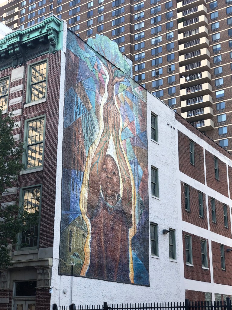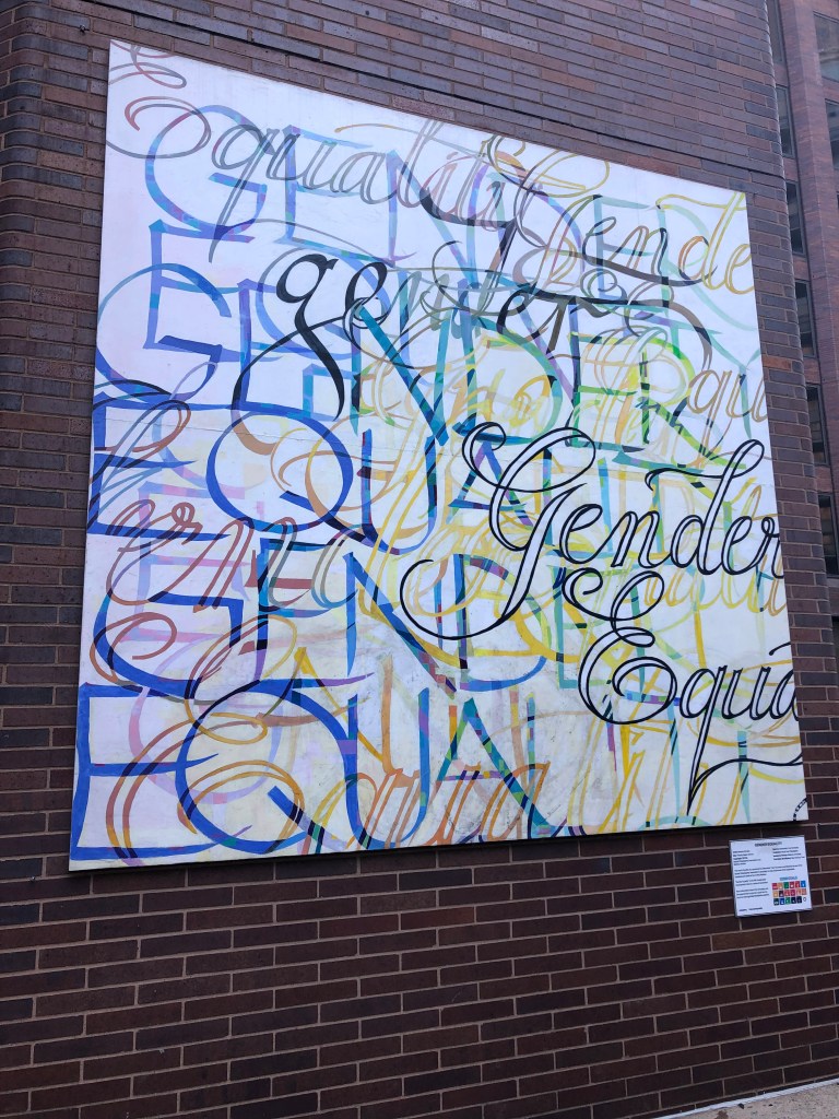 The first mural on our tour commemorated Goal #5: Gender Equality. Artist Barbara Smolen joined us and explained her design decisions. The mural combines various typography styles, with Roman letters evoking the Declaration of Independence while centering gender equality. Contrasting blue and yellow tones create luminosity, drawing attention upward from street level.